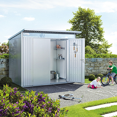 feuerverzinktes Stahlblech, Acrylglas-Oberlichter mit Dachvorsprung, sturmfest, inklusive Grundausstattung (Regalböden, Regalsteher, Werkzeughalter und Gerätehalter), in verschiedenen Größen und Farben erhältlich