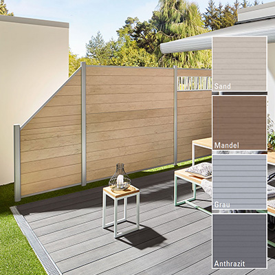 aus pflegeleichtem, witterungsbeständigem WPC, Profile mit je einer glatten Seite und einer Seite mit Längsnut, bestehend aus 12 Lamellen und 2 Aluminium-Abschlussleisten, in verschiedenen Farben, 178 x 183 cm