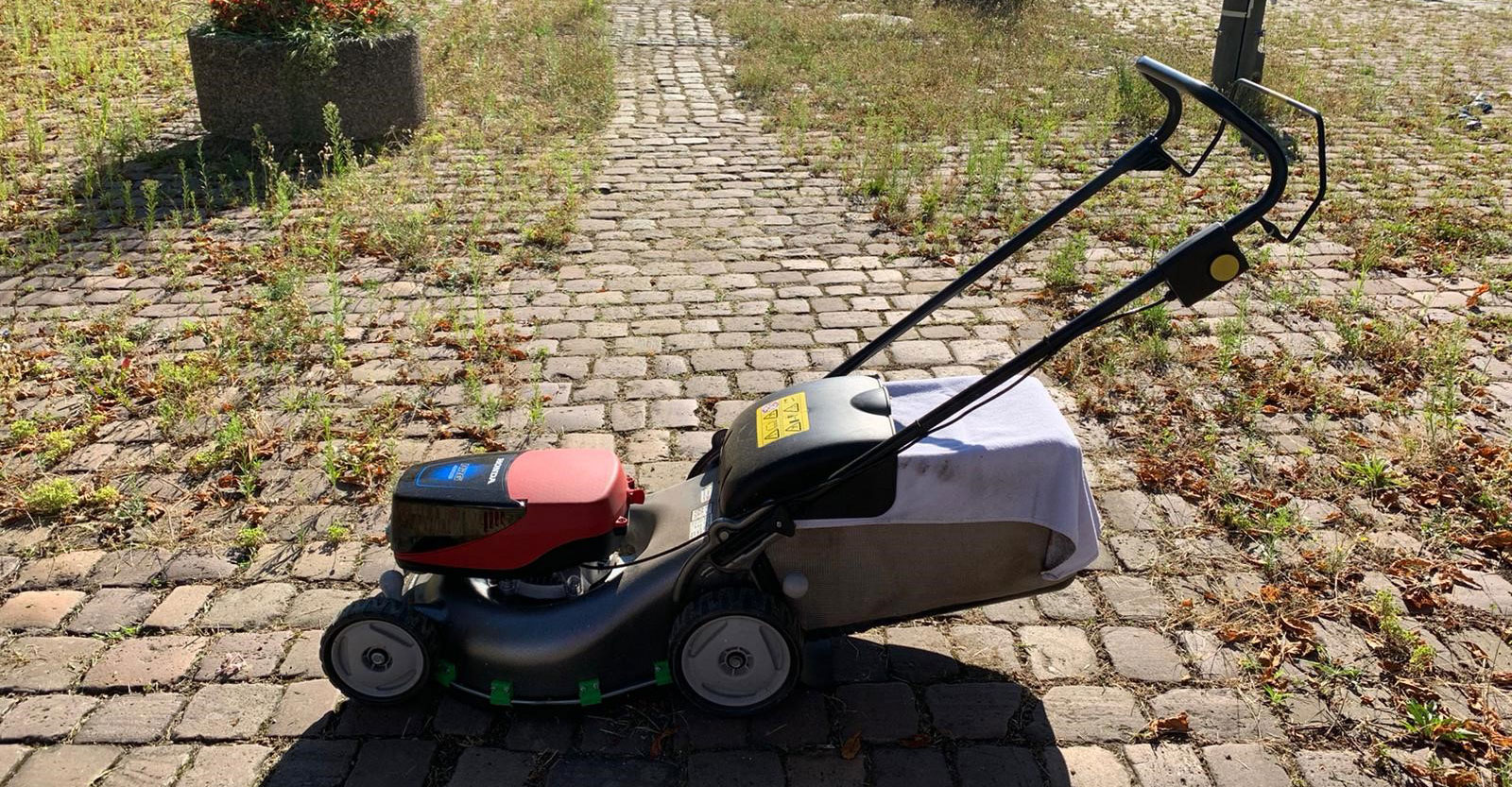 Arbeiten mit dem Kölle Akku, Rand- und Fugenblitz sowie mit dem Akku Laubbläser von Honda. Ein Akku – drei Geräte.