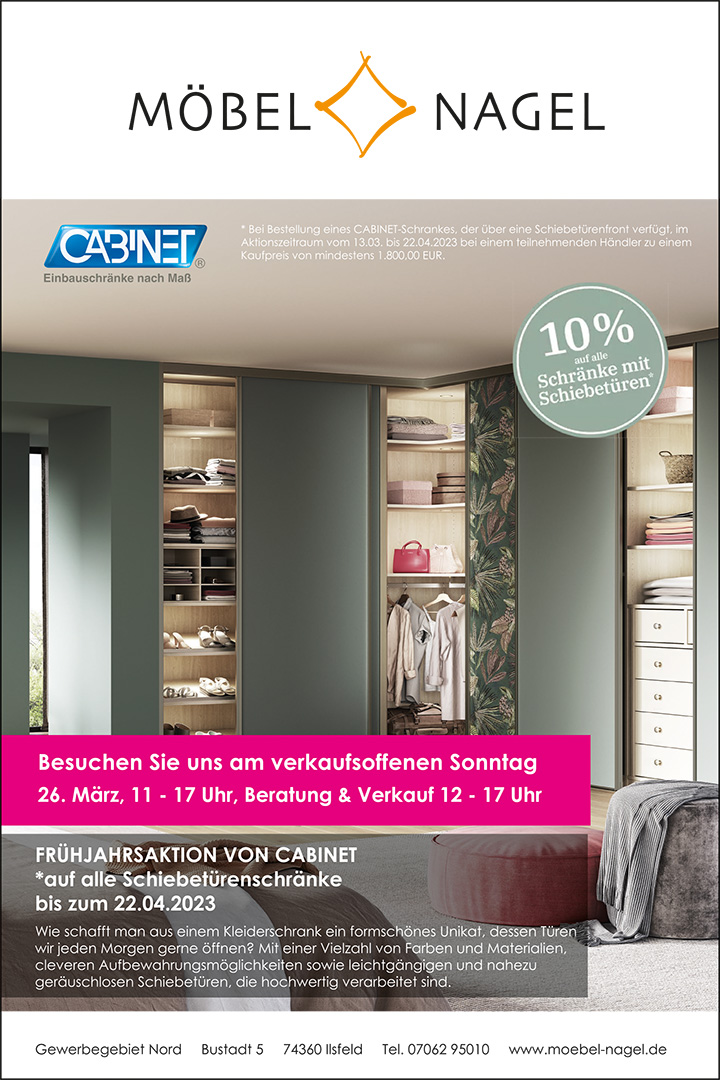 Am verkaufsoffenen Sonntag an diesem Wochenende können sich alle Interessierten ab 11 Uhr bei Möbel Nagel in Ilsfeld umschauen. Von 12 bis 17 Uhr steht das Team für Beratung und Verkauf zur Verfügung.