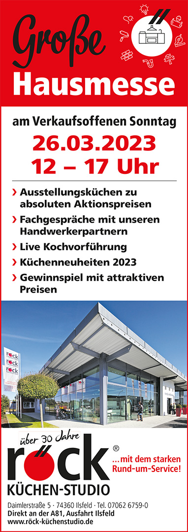 Hausmesse beim Küchenstudio Röck in Ilsfeld: Am Sonntag, 26. März, wird Besuchern zwischen 12 und 17 Uhr wieder ein bunter Mix aus Genuss und Information präsentiert – Gäste werden von Showkoch Malte Mehler mit schmackhaften Häppchen versorgt, und es sind zahlreiche Handwerkspartner vor Ort, die Auskunft darüber geben, wie die Arbeit aus einer Hand bei Röck abläuft. „Der Kunde hat zum Beispiel bei einer Komplettsanierung inklusive Böden, Malerarbeiten und Elektroinstallation nur mit uns zu tun und muss sich sonst um nichts kümmern“, betont Geschäftsführer Ulrich Weninger.