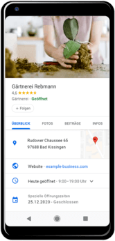 Für lokale Unternehmen bietet Google kostenlos einen Google-My-Business-Eintrag an, den Sie selbst erstellen können. Wenn ein Nutzer nach Ihrem Unternehmen oder nach nahelegenden Begriffen sucht, erscheint als erstes Ergebnis Ihr My-Business-Eintrag. Dieser macht es dem Nutzer einfacher, Sie zu kontaktieren oder Ihre Adresse für einen Besuch vor Ort herauszufinden.