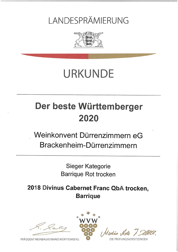Der im Barrique gereifte trockene purpurrote Wein wurde 2020 zum besten Württemberger Barriquewein gekürt und belegte den ersten Platz vinum in der Kategorie Cabernet Franc international. Die feinfruchtigen Nuancen nach dunklen Waldbeeren mit Anklängen von weißem Pfeffer und einem Hauch Tabak finden einen langanhaltenden, wärmenden Nachhall. Nachdem dieser Wein nun 1,5 Jahre vergriffen war, ist er nun endlich wieder erhältlich.